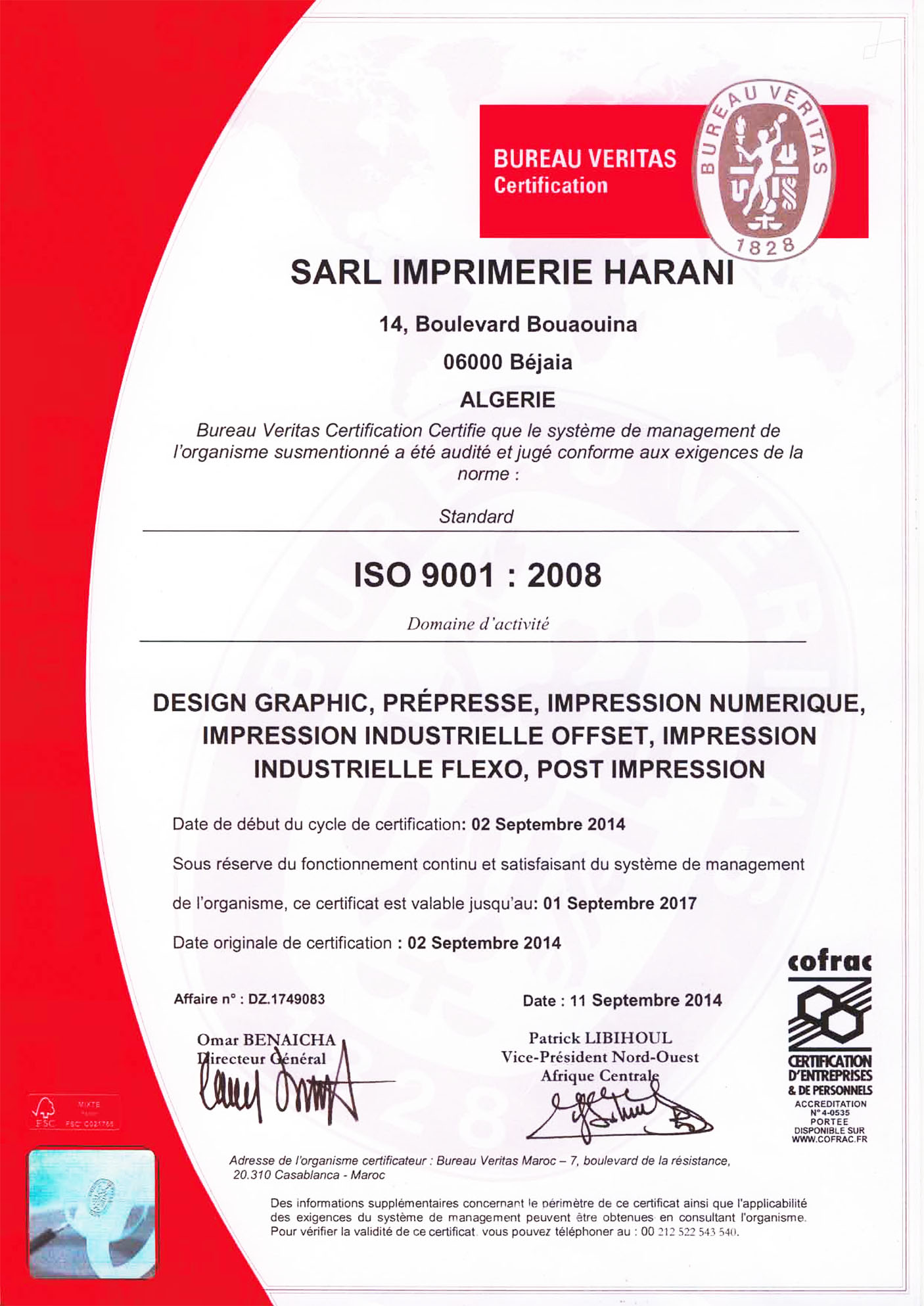 Cette certification, obtenue le 02 Septembre 2014, est la preuve de la conformité, de l’Imprimerie HARANI, aux exigences de la norme ISO 9001 du management de ses activités de design graphic, pré presse, impression numérique, impression industrielle offset, impression industrielle flexographie et post impression.